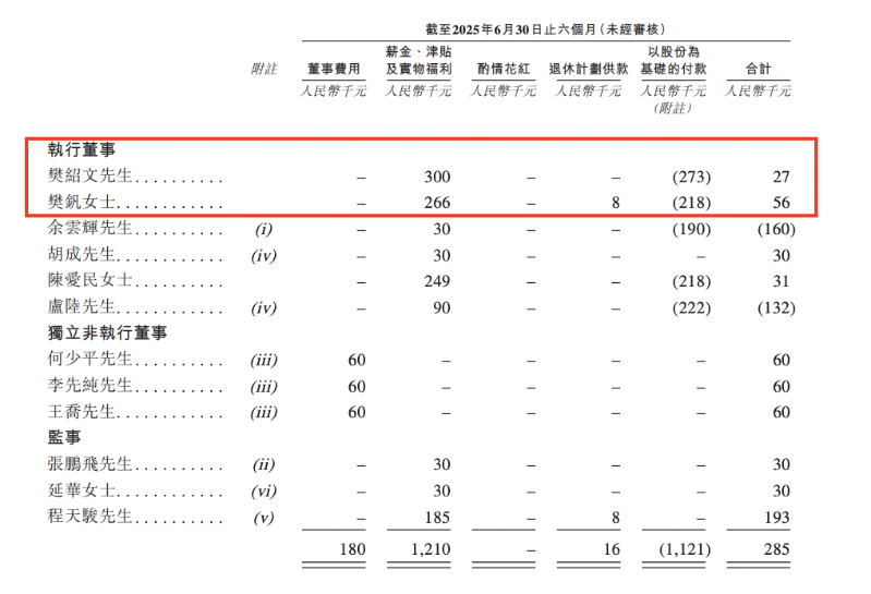 2025年上半年,樊绍文薪酬合计2.7万元,包括30万元薪金、津贴及实物福利,及-27.3万元以股份为基础的付款;樊钒薪酬合计5.6万元,包括26.6万元薪金、津贴及实物福利,0.8万元退休计划供款,及-21.8万元以股份为基础的付款。