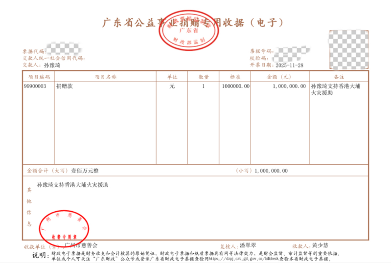 三七互娱联合创始人、广东省游心公益基金会理事长孙豫琦女士,为表达个人对香港受灾市民的关心,特在第一时间通过广州市慈善会,向香港大埔宏福苑火灾援助事项捐赠人民币100万元,用于灾民救助和善后工作。