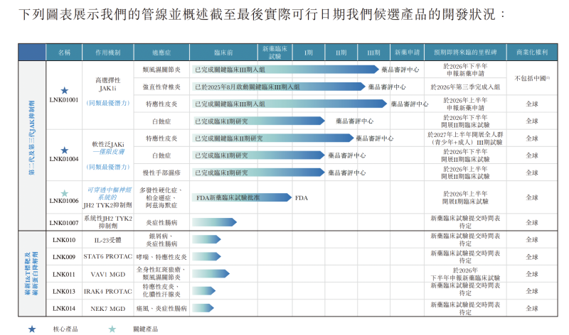截至最后实际可行日期,凌科药业已将核心候选产品LNK01001及LNK01004推进至临床阶段。目前,LNK01001正进行多项III期临床试验并预计于2026年上半年、2026年下半年及2027年下半年进入特应性皮炎、类风湿关节炎及强直性嵴椎炎的新药申请阶段。与此同时,公司已于2025年7月在中国完成靶向特应性皮炎的LNK01004II期试验,并计划于2027年上半年启动III期试验。