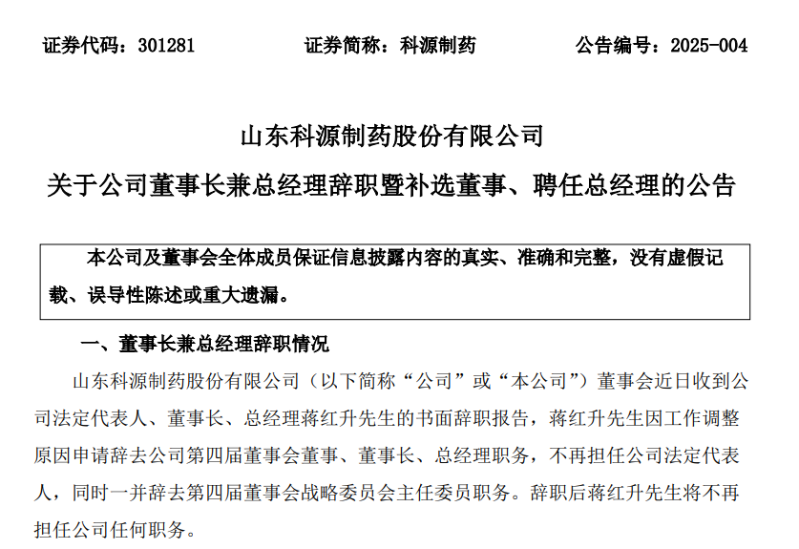 3月11日,科源制药发布公告,公司董事会近日收到公司法定代表人、董事长、总经理蒋红升的书面辞职报告,蒋红升因工作调整原因申请辞去公司第四届董事会董事、董事长、总经理职务,不再担任公司法定代表人,同时一并辞去第四届董事会战略委员会主任委员职务。辞职后蒋红升将不再担任公司任何职务。在选举新任董事长及产生新任法定代表人之前,蒋红升仍将继续履行法定代表人、董事长职责。