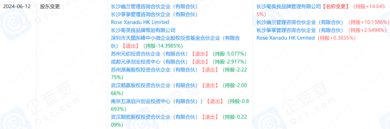 2024年6月,茶颜悦色发生大规模股权调整,包括天图资本、顺为资本、五源资本等5家投资方旗下7只基金悉数退出股东行列。截至目前,公司股东仅剩湖南茶悦品牌管理有限公司(由CYYS Tea Limited全资持股),以及Rose Xanadu HK Limited,持股比例分别为99.7203%、0.2797%。