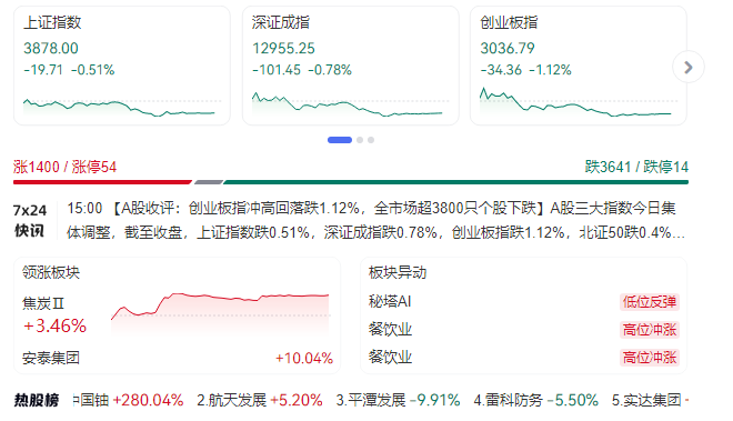 12月3日消息,市场全天震荡走弱,创指盘中跳水,三大指数集体收跌。截至收盘,沪指报3878.00点,跌0.51%;深证成指报12955.25点,跌0.78%;创指报3036.79点,跌1.12%。