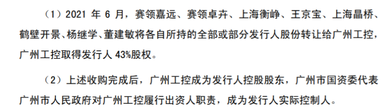 2021年6月,赛领嘉远、赛领卓卉、上海衡峥、王京宝、上海晶桥、鹤壁开景、杨继学、董建敏将各自所持的全部或部分天海电子股份转让给广州工控,广州工控取得天海电子43%股权。