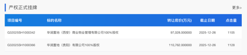《星岛》从上海联合产权交易所官网了解到,11月30日,华润置地(西安)商业物业管理有限公司(下称“华润西安”)100%股权、华润置地(贵阳)有限公司(下称“华润贵阳”)100%股权分别被挂牌转让,转让底价分别约为9.7亿元、11.08亿元,截止日期均为2025年12月26日。