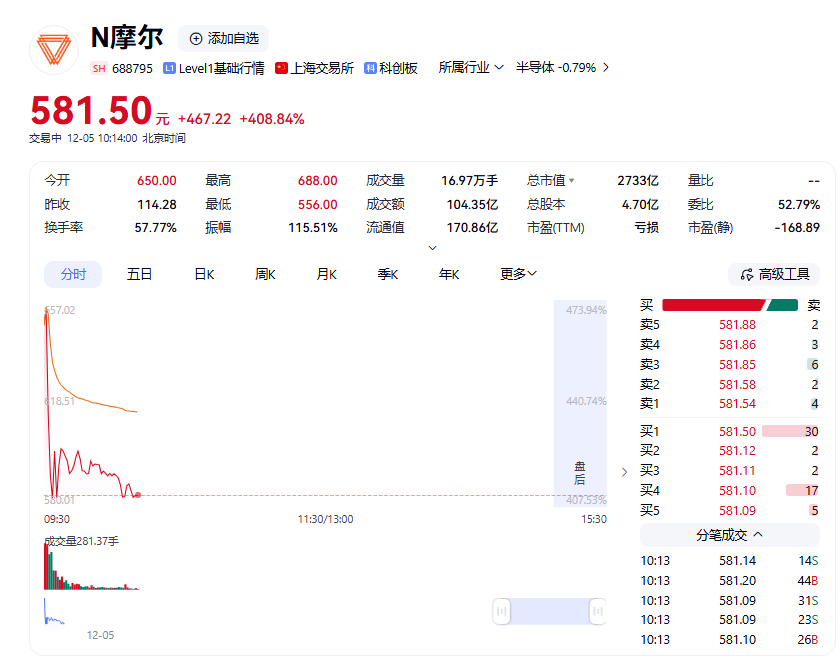 12月5日,被称为“国产GPU第一股”摩尔线程在科创板上市,该股竞价高开超468%,总市值近3055亿,股价报650元,单签盈利高达26.786万元。截至发稿,该股报581.5元/股,总市值为2733亿元。