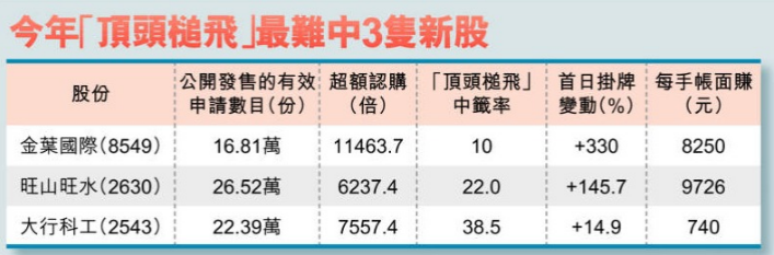 虽然货源减少及新股市场造好,但未必人人抽新股都有钱赚。不计转板和介绍形式上市,有53只新股在旧制下挂牌,当中只有13只新股获逾10万名散户认购;在新制下挂牌上市的35只新股中,有28只获逾10万名散户认购。改革后,“顶头槌飞”未能稳中新股的情况越见普遍,共有9宗,其中GEM股金叶国际(8549)最难中签,共有5,513张“顶头槌飞”,仅10%获发1手。辉立证券新股部经理陈英杰预计,散户之后会以“六合彩”心态认购,或转为选择性参与或认购小型新股。