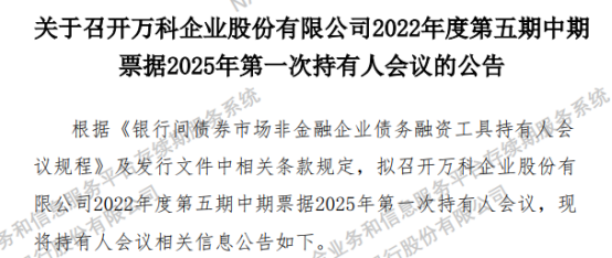 12月5日,交通银行以召集人身份发布公告,为稳妥推进债券本息兑付工作,该行拟于12月22日召开“22万科MTN005”持有人会议,审议该笔37亿元债券展期事宜。该债券票面利率3%,原定本金兑付日为2025年12月28日。