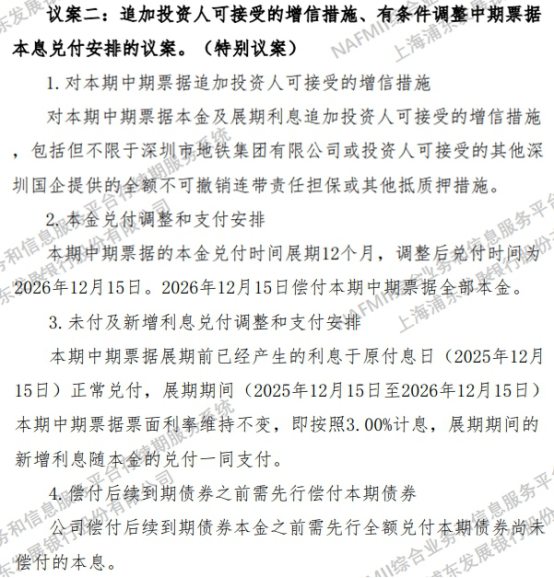 直到12月5日,浦发银行更新公告披露“22万科MTN004”调整后方案。《星岛》查询,该方案主要追加了投资人可接受的增信措施,包括但不限于深铁集团或其他深圳国企提供担保,债券已产生利息须于2025年12月15日正常兑付;同时,展期期间的新增利息随本金一同于2026年12月15日兑付,且顺序须优于其他到期债券。