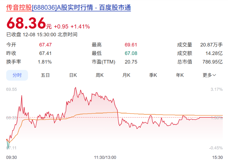 截至12月8日收盘,传音控股A股收盘于68.36元/股,总市值为786.95亿元。