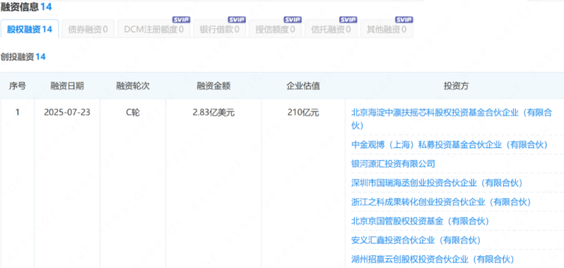 虽然百度没有公布过昆仑芯的营收数据,但自2021年独立融资以来,昆仑芯已有14笔创投融资记录。截至2025年7月,昆仑芯融资轮次已至D轮,融资金额达到2.83亿美元,投资方中出现北京市政府引导基金、南网基金、比亚迪、中银金融、中金资本的身影。目前投后估值也从2021年的130亿元涨至约210亿元人民币。