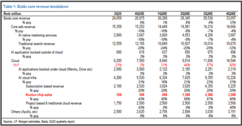 财务数据则是支撑企业估值的基础。摩根大通在11月的研报中预测,2026年昆仑芯销售额可增长6倍至83亿元,百度云收入将因此大幅增长。