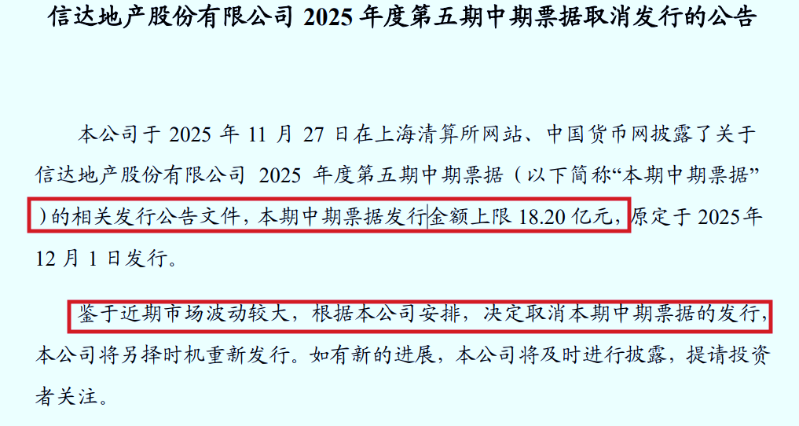 近日,信达地产股份有限公司发布公告,宣布取消原定于12月1日发行的中期票据,涉及18.2亿元募资额。对于取消发行的原因,公司表示系近期市场波动较大,后续将另择时机重启发行。