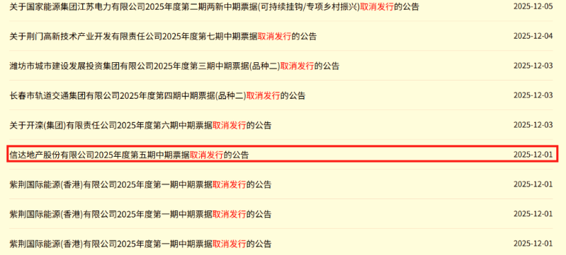 据《星岛》不完全统计,12月首周,除信达地产外,潍坊城投、荆门高新开发等多家涉房国央企平台取消了票据发行计划。