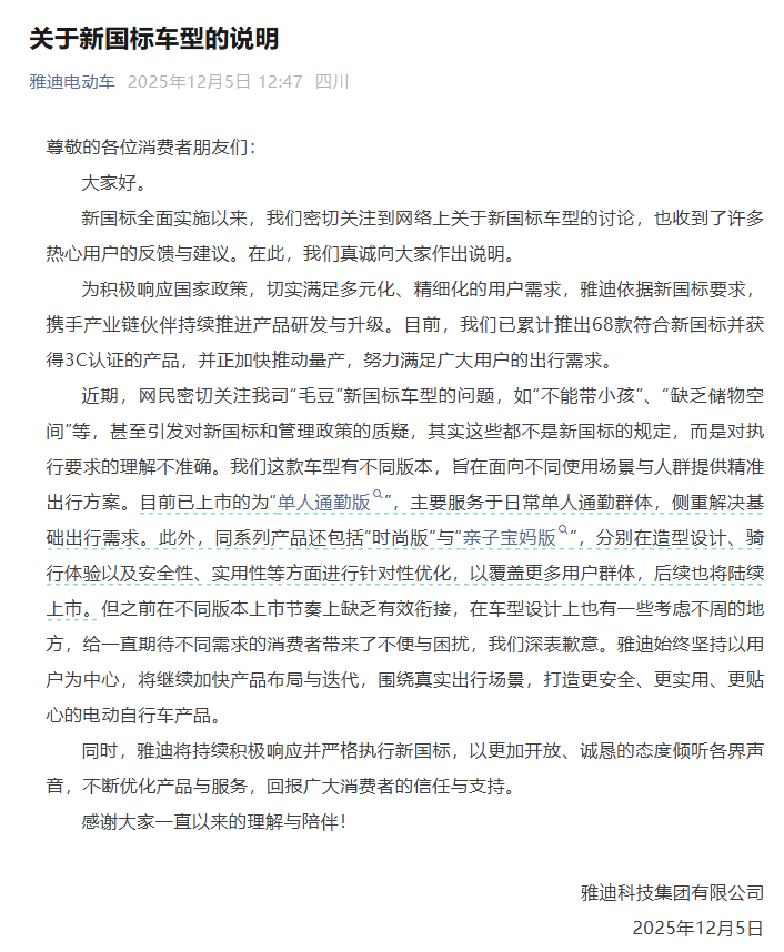 近日,雅迪电动车受到了舆论的关注。事件的起因在于近期雅迪新推出的一款名为“毛豆”的新国标电动车,引发了网上的争议和疑惑:包括时速超过25公里就会断电、鞍座必须是金属的、不能安装后视镜、不能带小孩等。在此背景下,12月5日,雅迪发文表示,该公司电动车在车型设计上考虑不周,对此深表歉意。