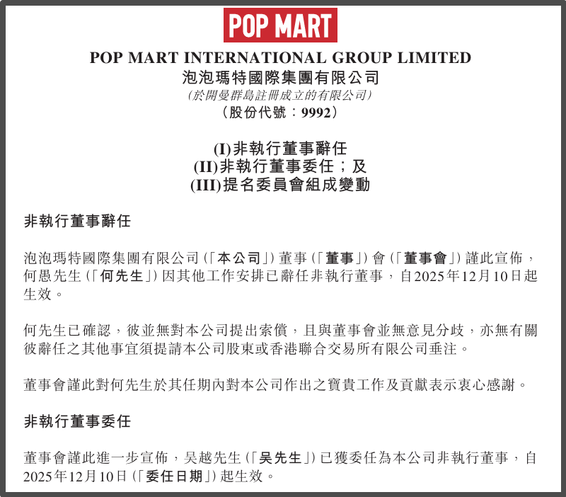 这一人事变动不仅标志着泡泡玛特治理结构的迭代升级,更显露出其加速推进品牌高端化、全球化战略的野心。