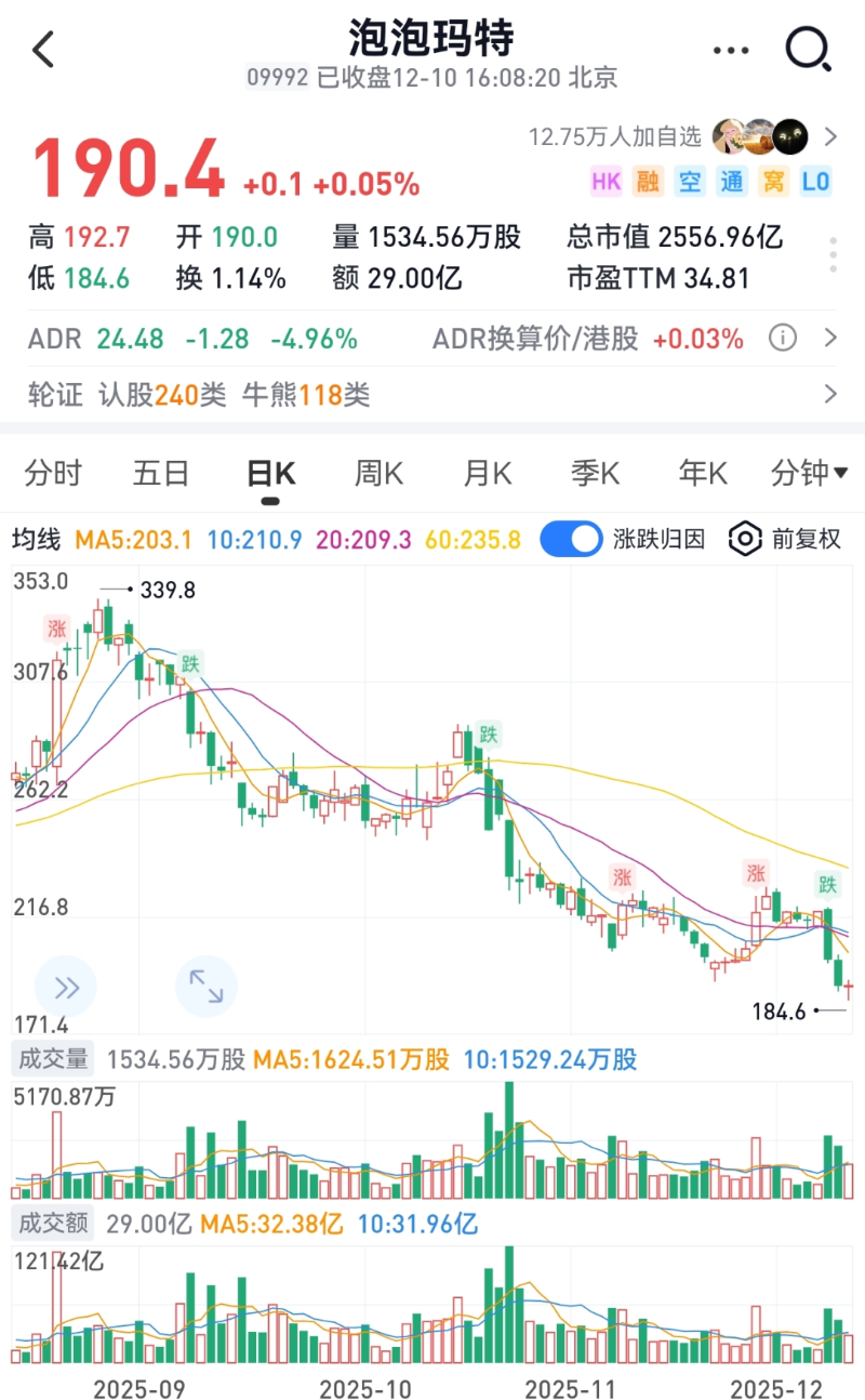 不过,需要注意的是,由于多个大行纷纷发布看空报告,近期泡泡玛特股价受创。12月8日、9日,泡泡玛特股价单日跌幅分别达到8.49%、5.04%。截至12月10收盘,泡泡玛特股价微涨0.05%,为190.4港元/股,相较于8月高位跌超40%,市值蒸发逾1400亿港元。