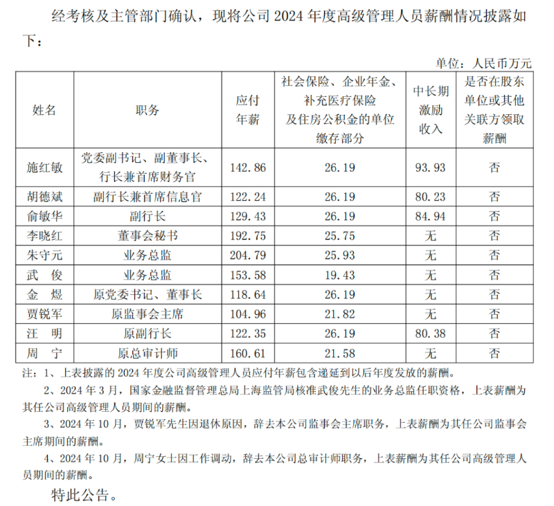 公告显示,公司党委副书记、副董事长、行长兼首席财务官施红敏2024年度应付年薪为142.86万元,社会保险、企业年金等单位的缴存部分为26.19万元,中长期激励收入为93.93万元,合计262.98万元。