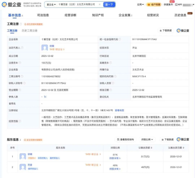 爱企查App显示,十翼范曾(北京)文化艺术有限公司成立于今年12月2日,法定代表人为徐萌,注册资本100万元人民币,经营范围包括文艺创作、金银制品销售、珠宝首饰零售等。股东信息显示,该公司由徐萌和范曾分别持股51%、49%,徐萌为该公司实际控制人。