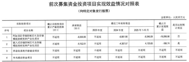 截至2025年10月31日,公司前次定增已累计使用6.97亿元的募集资金,投资进度为70.48%,尚未完工。同时,公司PCIeSSD研发及产业化、嵌入式存储研发及产业化两大项目尚未达产,累计实现效益分别为-1.61亿元、-186.74万元。