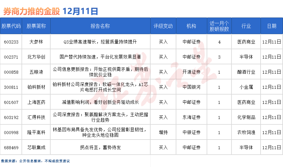 大参林最受券商关注,近一个月获国信证券、西南证券等4份券商研报关注,位居12月11日券商力推股榜首。