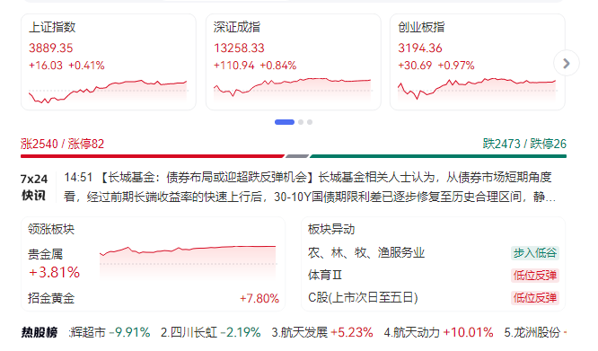 12月12日消息,市场探底回升,情绪逐步回暖,三大指数集体收红。截至收盘,沪指报3889.35点,涨0.41%;深证成指报13258.33点,涨0.84%;创指报3194.36点,涨0.97%。