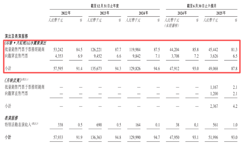 财务数据背后,其“一剧独大”的业务结构暗含经营风险。过去三年,来自《印象·大红袍》的门票收入占公司总收入九成以上,2025年上半年虽降至87.8%,但仍处于绝对主导地位。同时,这一业务的毛利率总体维持在55%-64%左右(2022年受疫情影响降至38%),显著高于其他业务,进一步凸显核心IP的不可替代性。