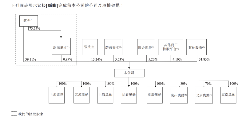 递表前,奥动新能源由蔡东青直接拥有约39.11%及由珠海奥立直接拥有约0.99%,珠海奥立为公司的员工持股平台之一,由蔡东青作为唯一普通合伙人控制。蔡东青及珠海奥立为公司的控股股东。
