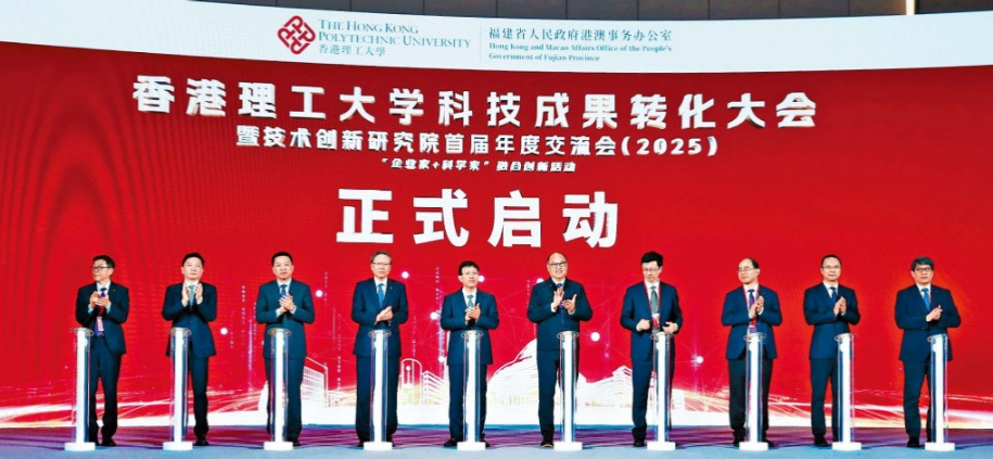 知识转移是推动创新的核心动力,将前沿科技转化为实际产业效益,方能真正造福社会。香港理工大学(理大)联同福建省人民政府港澳事务办公室,在12月13至14日于晋江市成功举办“理大科技成果转化大会暨技术创新研究院首届年度交流会”,构建科研与产业精准对接的桥梁。为期两天的活动吸引超过3,500名来自香港及内地各省市的政产学研代表、投资者齐聚一堂,通过主题论坛、成果展览、圆桌对话等多元形式,集中展示理大的顶尖科研成果,助力创新技术“落地”实践。