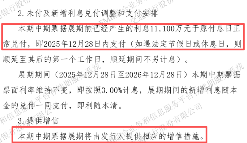 议案二为优化版本,在本金展期一年的基础上,承诺1.1亿元原利息于12月28日正常兑付,同时提出由万科提供增信,但未披露具体细节。这一调整与“22万科MTN004”二次方案的展期逻辑高度重合。