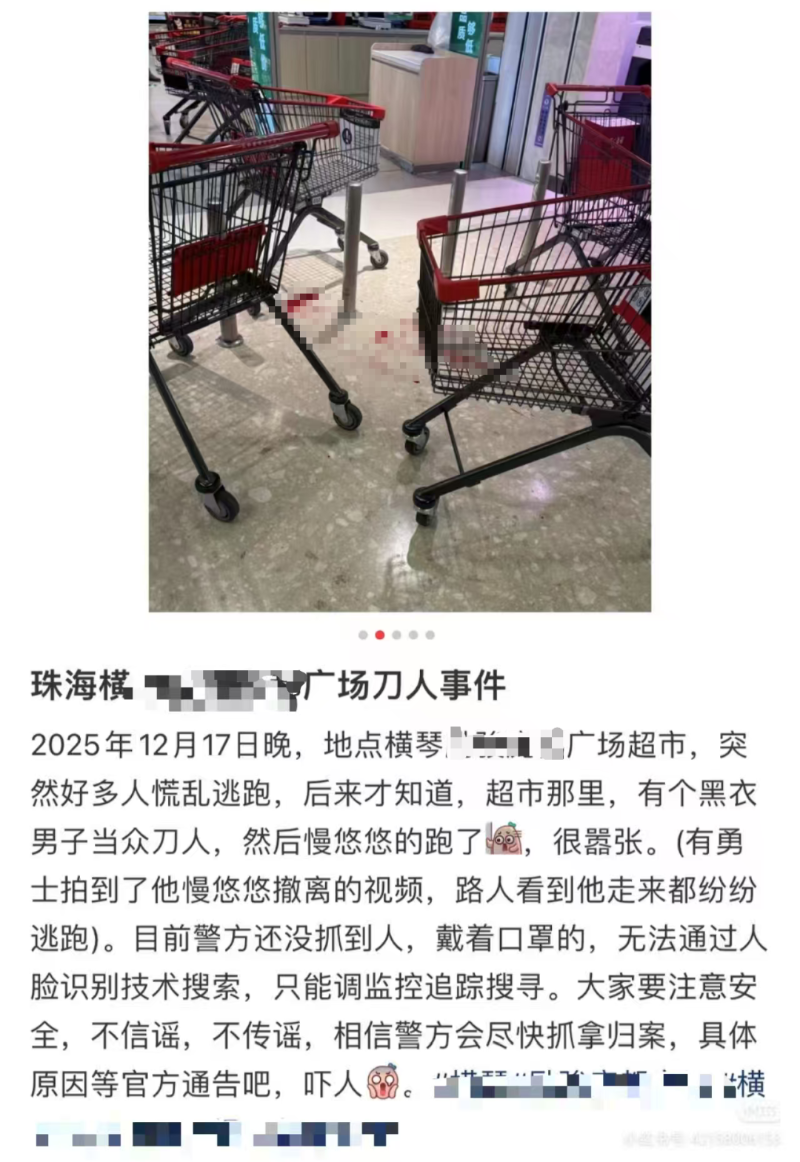 12月17日晚,有网友爆料称珠海横琴励骏庞都广场发生一起持刀伤人事件。据目击者反映,一名黑衣男子在超市购物时与顾客产生纠纷,随后发生持刀伤人事件,现场有血迹。