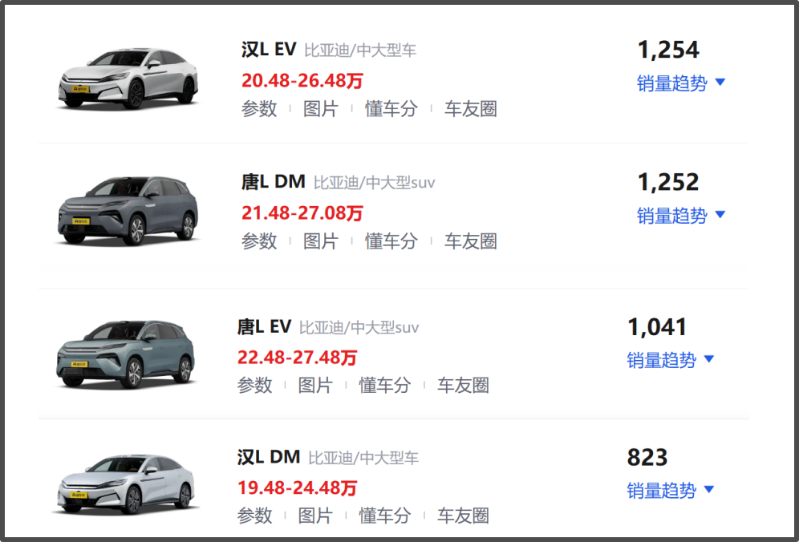 曾承载汉唐“重回高端”厚望的比亚迪汉L与唐L,在上市半年后销量持续下滑。据懂车帝数据,2025年11月,汉L(含DM与EV版本)销量已跌至2077辆,唐L同期销量为2293辆,较上市初期高点均已下降逾50%。
