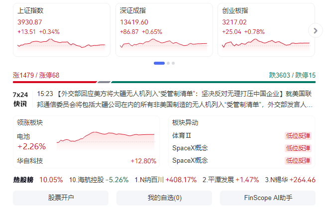 12月23日消息,市场冲高回落,尾盘拉升,三大股指集体收红。截至收盘,沪指报3919.98点,涨0.07%;深证成指报13368.99点,涨0.27%;创指报3205.0点,涨0.41%。