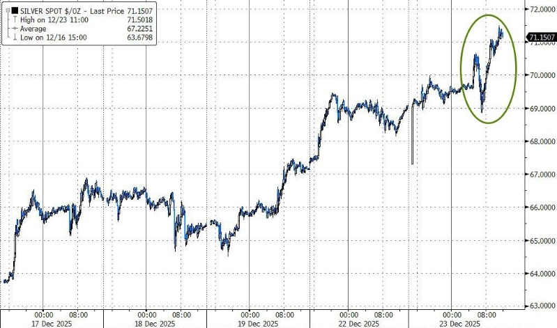 纽约时间周二,现货白银日内最高涨幅3.7%,最高达到每盎司71.58美元,创历史新高,这也是白银首次突破每盎司70美元。