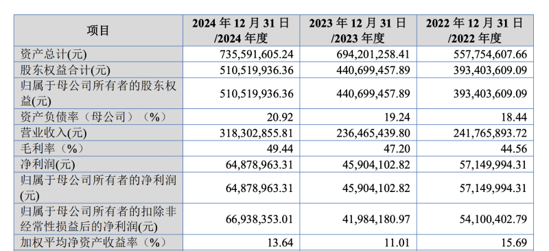 2022年至2024年,普昂医疗营收分别为2.42亿元、2.36亿元、3.18亿元,归母净利润分别为5715万元、4590.41万元、6487.9万元,毛利率分别为44.56%、47.2%、49.44%。