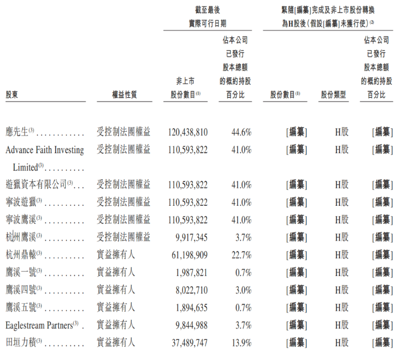 其上市股权架构中,有28位直接股东,股权相对分散。杭州鼎辕作为第一大股东直接持股22.67%;应伟不直接持股,其通过杭州鼎辕、田垣力积、鹰溪一号、鹰溪四号、鹰溪五号、Eaglestream Partners控制44.6%的权益。