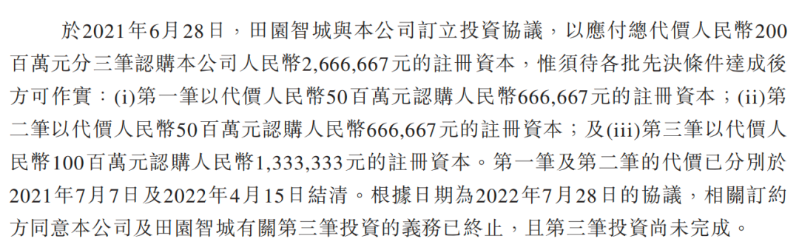 2021年6月28日,田园智城与力积存储签订协议,附“先决条件”以2亿元分三笔认购力积存储约266.67万元注册资本,2021年7月和2022年4月,前两笔以5000万元认购66.67万元注册资本结清,第三笔投资义务终止,合计出资1亿元。田园智城成立于2012年11月,实控人为金华市国资委。