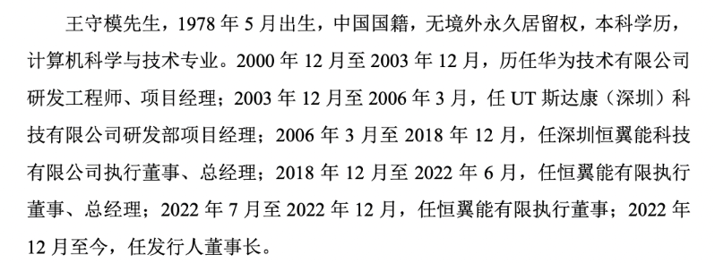 资料显示,王守模,1978年5月出生,中国国籍,无境外永久居留权,本科学历,计算机科学与技术专业。2000年12月至2003年12月,历任华为技术有限公司研发工程师、项目经理;2003年12月至2006年3月,任UT斯达康(深圳)科技有限公司研发部项目经理;2006年3月至2018年12月,任深圳恒翼能科技有限公司执行董事、总经理;2018年12月至2022年6月,任恒翼能有限执行董事、总经理;2022年7月至2022年12月,任恒翼能有限执行董事;2022年12月至今,任公司董事长。