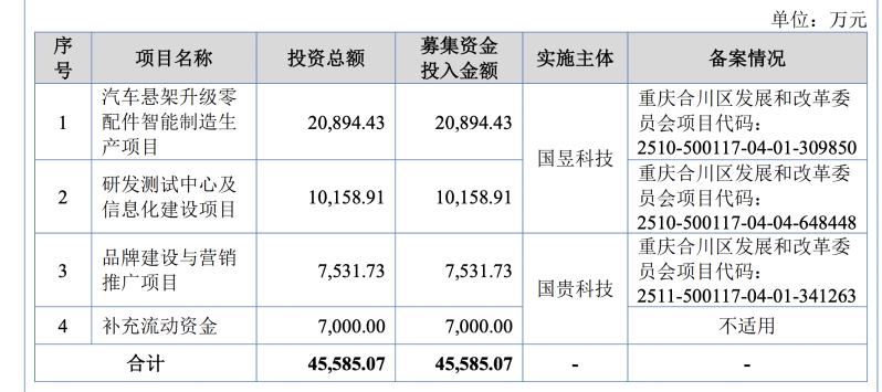 本次IPO,国贵科技拟募集资金4.56亿元,将用于汽车悬架升级零配件智能制造生产项目、研发测试中心及信息化建设项目、品牌建设与营销推广项目、补充流动资金。