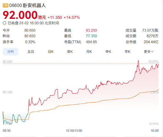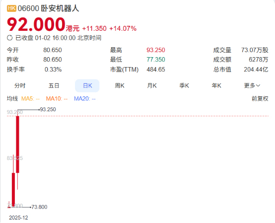卧安机器人上市后连涨三天表现极为强势,1月2日,该股最高触及93.25港元,收报92.00港元,单日大涨11.35港元,涨幅高达14.07%。以收盘价计算,其总市值已达204.44亿港元。