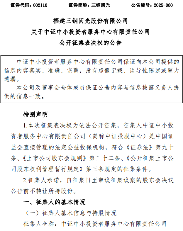 《星岛》1月5日盘后获悉,为落实国务院办公厅《关于上市公司独立董事制度改革的意见》,依据《上市公司独立董事管理办法》,中证中小投资者服务中心有限责任公司(简称中证投服中心)秉持市场化、法治化的原则,向福建三钢闽光股份有限公司(简称三钢闽光,002110.SZ)董事会提名独立董事候选人林兢,并就独立董事选任议案向全体股东公开征集表决权。