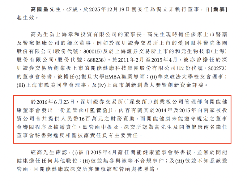 尽管存在监管函,万怡医学董事认为,高国垒具备董事所需的经验、知识及技能,故根据上市规则第3.08及3.09条适合担任董事。