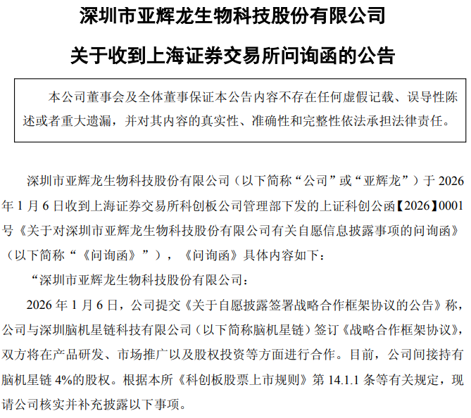 1月6日晚间,深圳市亚辉龙生物科技股份有限公司(688575.SH,以下简称"亚辉龙")公告披露,公司于当日收到上海证券交易所科创板公司管理部下发的问询函,要求公司就与深圳脑机星链科技有限公司(以下简称"脑机星链")签署战略合作框架协议事项进行补充说明。