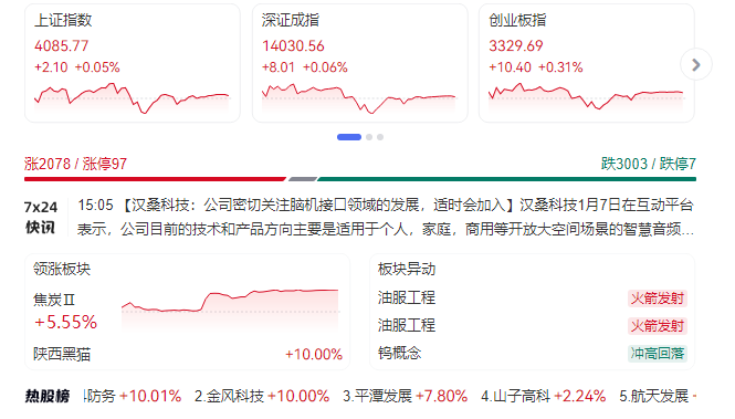 1月7日消息,三大指数集体收涨,沪指微涨0.05%录得14连阳。截至收盘,沪指报4085.77点,涨0.05%;深证成指报14030.56点,涨0.06%;创指报3329.69点,涨0.31%。