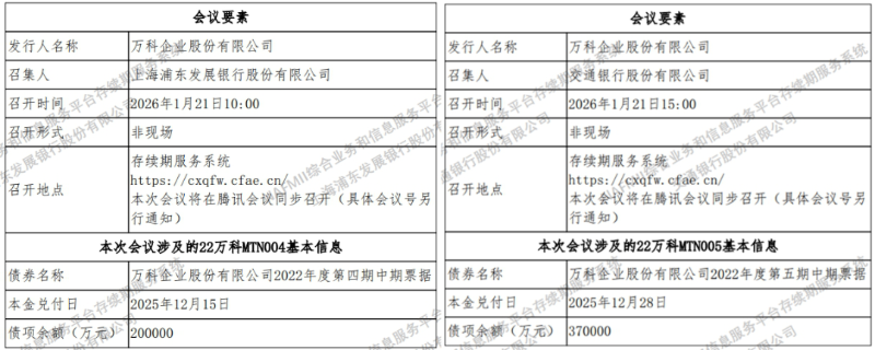 根据1月7日晚间公告,两笔中票最新的持有人会议已确定时间。其中,“22万科MTN004”将于1月21日上午10点再次召开持有人会议;“22万科MTN005”持有人会议则于1月21日下午3点召开。