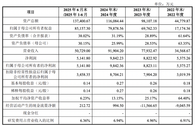2022年-2024年及2025年上半年,高特电子营业收入分别为3.46亿元、7.79亿元、9.19亿元及5.07亿元;净利润分别为5375.26万元、8822.92万元、9842.23万元及5141.8万元;综合毛利率分别为 28.53%、26.56%、26.02%及 22.01%;加权平均净资产收益率分别为64.4%、25.17%、13.15%、6.23%。