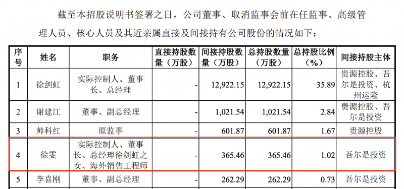 另外,徐剑虹之女徐雯任海外销售工程师,间接持股1.02%。