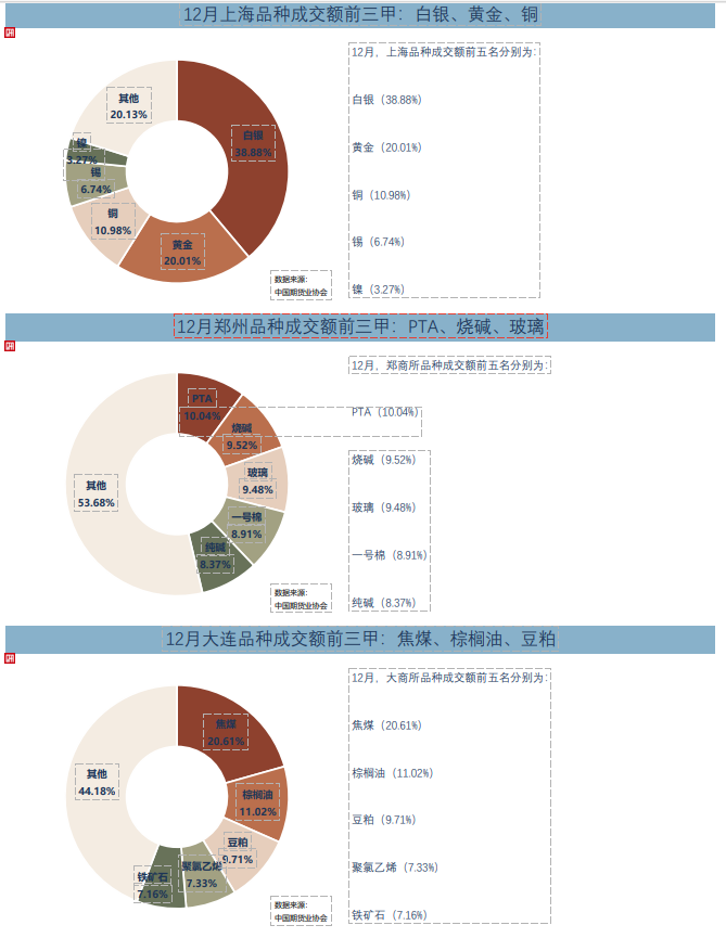 其中,按照成交额统计,排名各商品期货交易所前三的品种分别为上期所的白银、黄金、铜,郑商所的PTA、烧碱、玻璃,大商所的焦煤、棕榈油、豆粕,广期所的碳酸锂期货、多晶硅期货、铂期货;按照成交量统计,排名各交易所前三的品种分别为上期所的白银、螺纹钢、白银期权,郑商所的玻璃、PTA、甲醇,大商所的豆粕、聚氯乙烯、焦煤,广期所的碳酸锂期货、碳酸锂期权、工业硅期货。