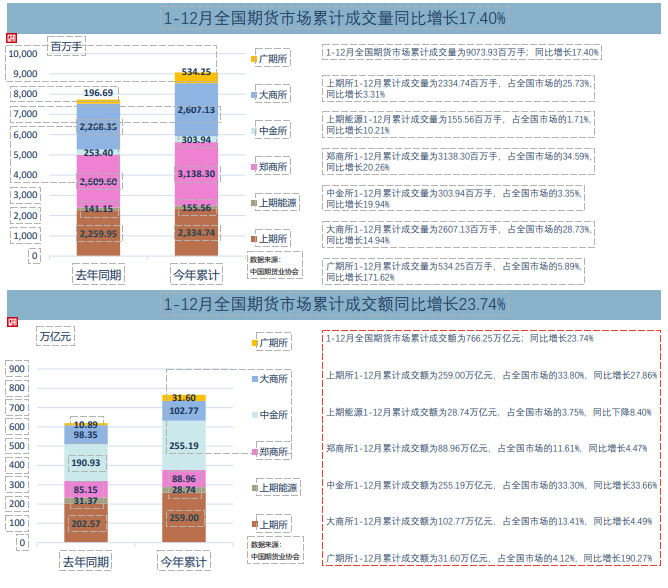 中国期货业协会最新统计资料表明,以单边计算, 12月全国期货市场成交量为9.51亿手(950,861,042手),成交额为90.81万亿元(908,056.76亿元),同比分别增长45.17%和58.55%。1-12月全国期货市场累计成交量为90.74亿手(9,073,926,691手),累计成交额为766.25万亿元(7,662,537.24亿元),同比分别增长17.4%和23.74%。