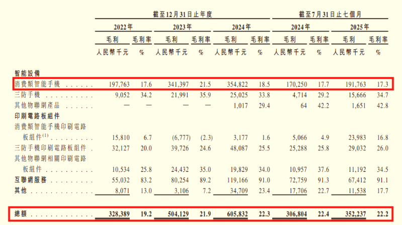 价格下滑直接传导至利润端。2025年前7个月,酷赛智能消费类智能手机出货256万件,贡献11.08亿元的收入,占总收入的70%,但该板块毛利率从2023年的21.5%大幅降至2025年前7个月的17.3%,致使公司整体净利润率从8.8%下滑至6.5%。