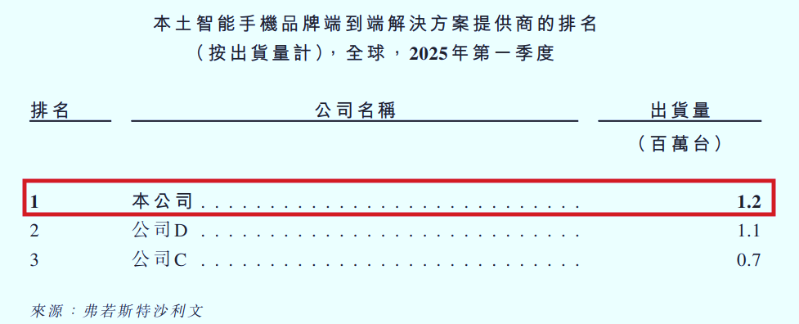 酷赛智能此番招股,频繁引用一份来自弗若斯特沙利文的数据,宣称“2024年按出货量计算,酷赛智能是全球第二大面向本土智能手机品牌的ODM解决方案提供商,并于2025年第一季度升至榜首”。